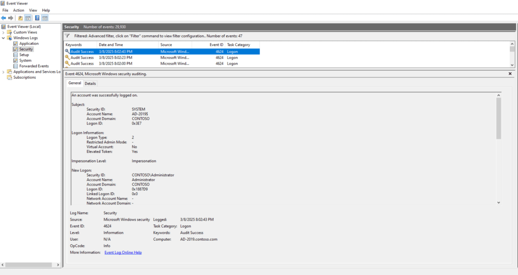 O evento 4672 é registrado no log de segurança sempre que uma conta efetua logon e recebe um token de segurança contendo privilégios especiais. Esse evento geralmente acompanha um logon bem-sucedido (evento 4624) e é gerado automaticamente pelo sistema para contas que possuem permissões elevadas, como Administradores, Serviços do sistema (SYSTEM) ou contas de serviço com permissões avançadas.