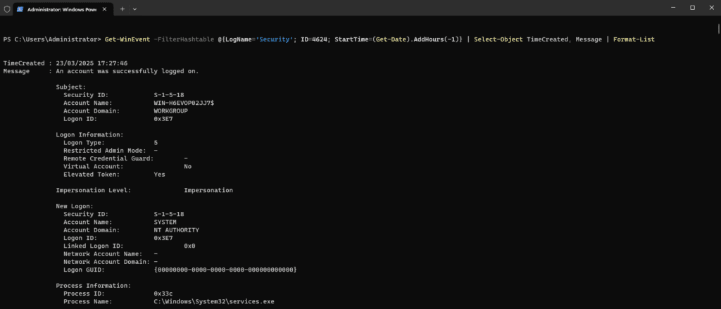 Get-WinEvent -FilterHashtable @{LogName='Security'; ID=4624; StartTime=(Get-Date).AddHours(-1)} | Select-Object TimeCreated, Message | Format-List