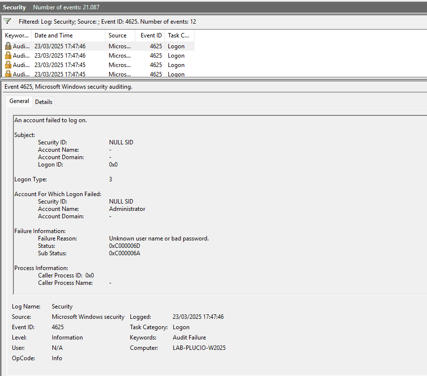 - Identificar os Event IDs relacionados no log de segurança (como o 4625, para falha de login).
