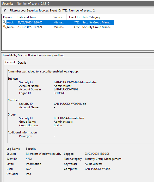 O evento 4732 é registrado no log de segurança do Windows sempre que um usuário é adicionado a um grupo de segurança habilitado localmente, como Administradores, Backup Operators ou Power Users. Este evento é crítico para auditoria e segurança, pois alterações em grupos privilegiados podem indicar movimentos laterais em ataques, escalonamento de privilégios ou mudanças administrativas legítimas que precisam ser monitoradas.