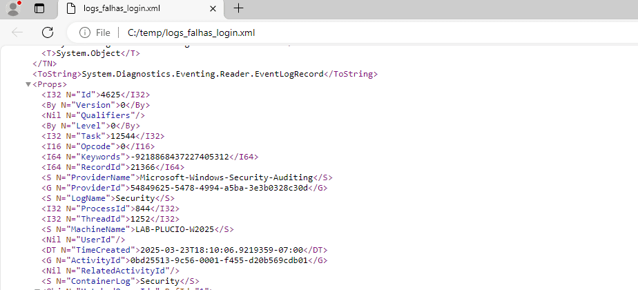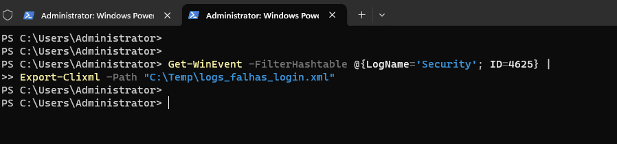 Para facilitar a análise forense ou o armazenamento de evidências, é possível exportar eventos do log de segurança utilizando PowerShell. O comando abaixo salva todos os eventos de falha de login (ID 4625) em um arquivo .xml no formato Clixml, que pode ser reimportado posteriormente com todos os detalhes preservados