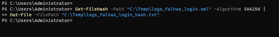 Get-FileHash -Path "C:\Temp\logs_falhas_login.xml" -Algorithm SHA256 |