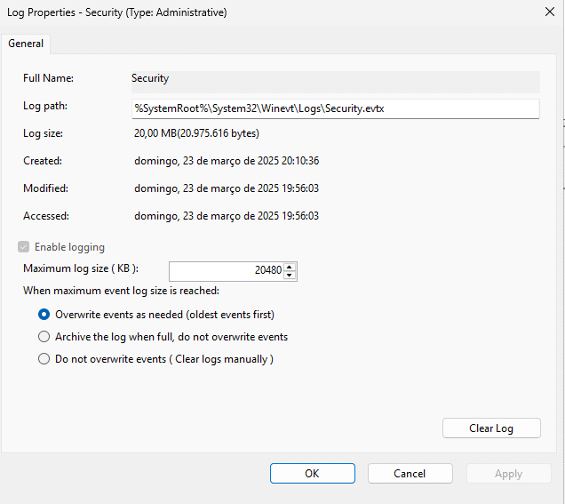 Aumentar o tamanho dos logs de segurança é uma prática essencial em ambientes corporativos. Por padrão, o Windows define um limite relativamente baixo, o que pode causar a sobrescrita automática de eventos importantes em curto prazo.