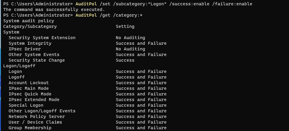 AuditPol /set /subcategory:"Logon" /success:enable /failure:enable