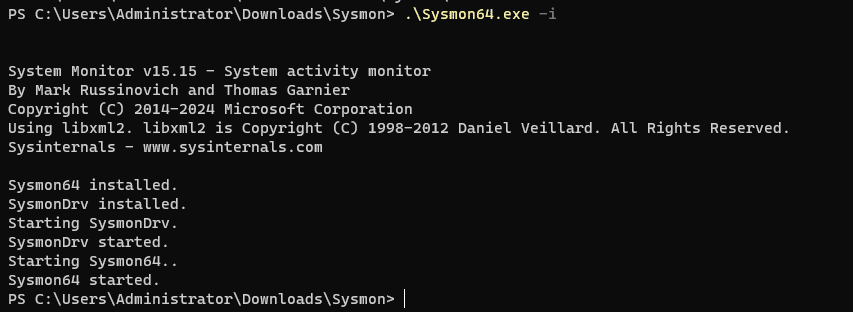 .\Sysmon64.exe -accepteula -i "C:\Users\Administrator\Downloads\sysmon-config-master\sysmon-config-master\sysmonconfig-export.xml"