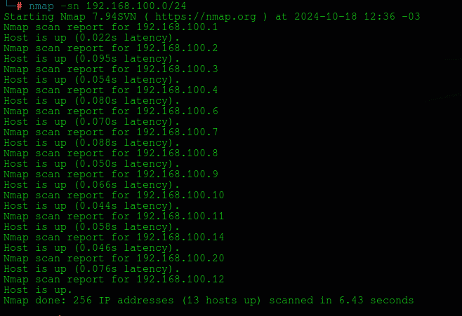 Explicação: O parâmetro -sn realiza uma varredura de ping, identificando quais hosts estão ativos na rede sem fazer uma varredura de portas.