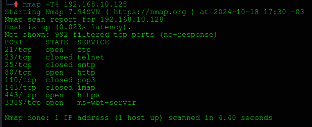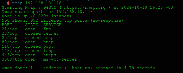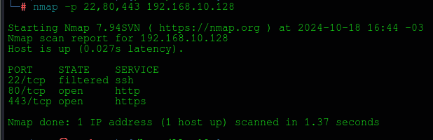 Explicação: Aqui, o Nmap varre as portas 22 (SSH), 80 (HTTP) e 443 (HTTPS) do host.
