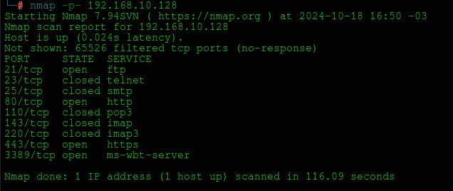 Explicação: O -p- indica que o Nmap deve varrer todas as 65535 portas TCP, ideal para identificar serviços em portas não convencionais.