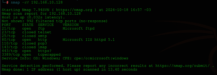 Explicação: O -sV identifica quais serviços estão rodando nas portas abertas e suas versões.
