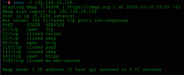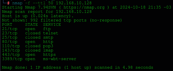 Explicação: O -f fragmenta os pacotes TCP, dificultando a detecção por sistemas de IDS que monitoram padrões de pacotes.