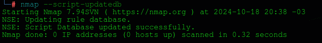 Explicação: O --script-updatedb força o Nmap a reindexar os scripts disponíveis no diretório de scripts (normalmente algo como /usr/share/nmap/scripts/). Se novos scripts forem adicionados manualmente, copiados ou baixados, o comando faz com que o Nmap detecte esses scripts e atualize o banco de dados para garantir que eles estejam disponíveis para uso em varreduras futuras.