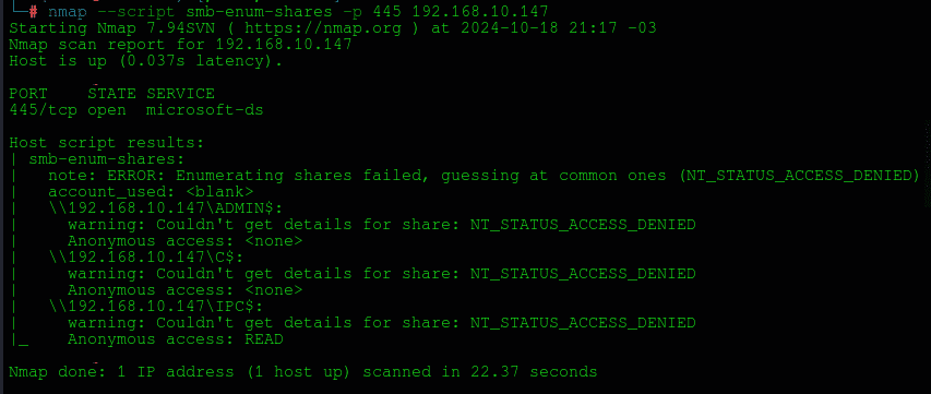 nmap --script smb-enum-shares -p 445 192.168.10.147