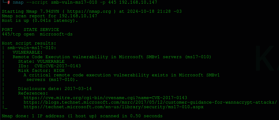 Explicação: Verifica se o host é vulnerável à falha MS17-010, utilizada pelo ransomware WannaCry.