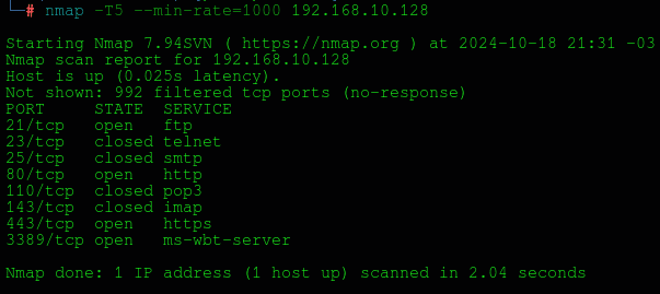 Explicação: Ajusta a velocidade da varredura para um nível agressivo com -T5 e define uma taxa mínima de pacotes por segundo com --min-rate.
