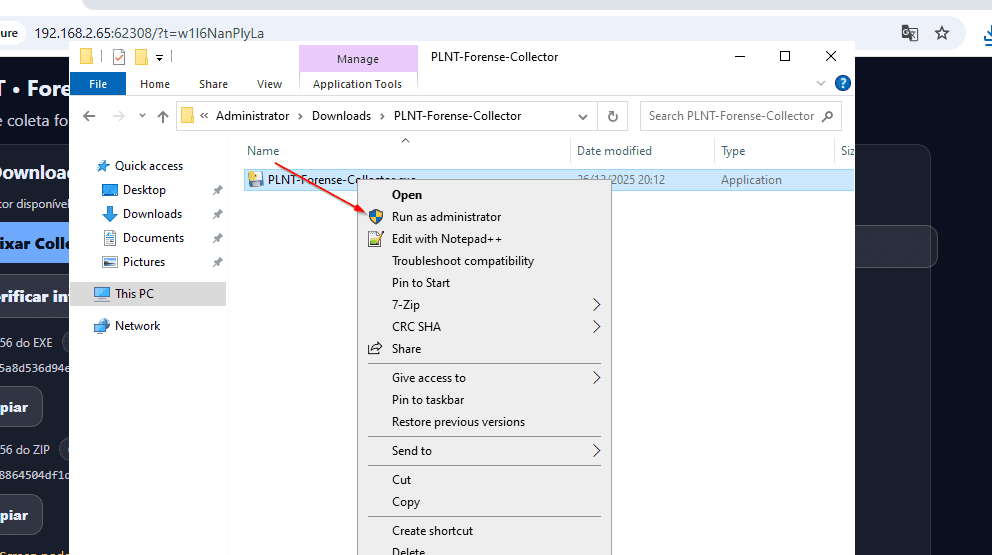 Collector.exe. - Coleta e Envio: O Collector realiza a varredura local, gera um pacote compactado (ZIP) e permite que esse arquivo seja enviado de volta para o servidor PLNT diretamente pelo navegador.
