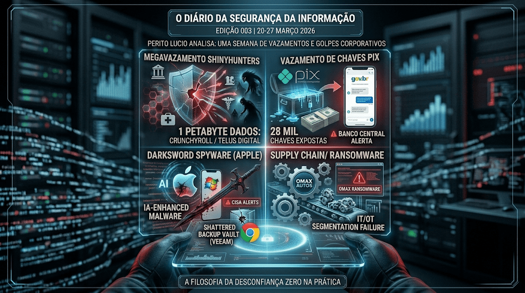semana final de março de 2026 escancarou uma dura realidade: nenhuma instituição, pública ou privada, está imune. Tivemos a confirmação oficial do Banco Central sobre o vazamento de milhares de chaves Pix, enquanto o submundo da Dark Web celebrava o roubo de 1 Petabyte de dados que atingiu até mesmo a gigante dos animes, Crunchyroll. Em paralelo, malwares sofisticados com Inteligência Artificial começam a atingir o ecossistema da Apple. Como perito forense, analisei os 8 eventos mais críticos desta semana. Vamos dissecar as evidências e entender como a segurança da informação falhou — e como podemos nos proteger.